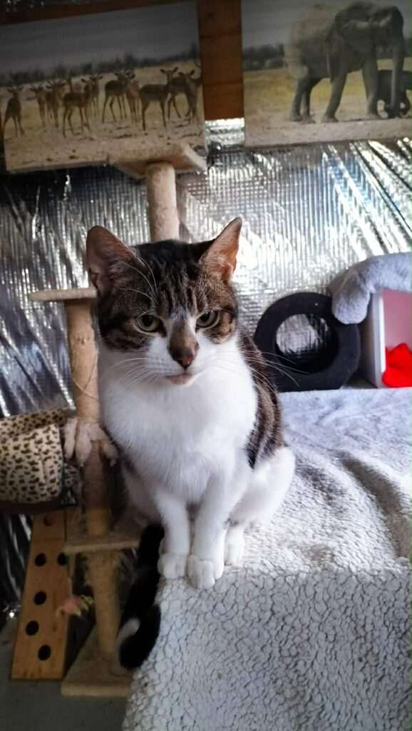 Her fosterer describes her as very friendly and dribbles with pleasure when stroked. She was used to being an outdoor cat but has settled in the fosterer’s pen. She has lived with another cat. She would suit an older person household or a household with no children.